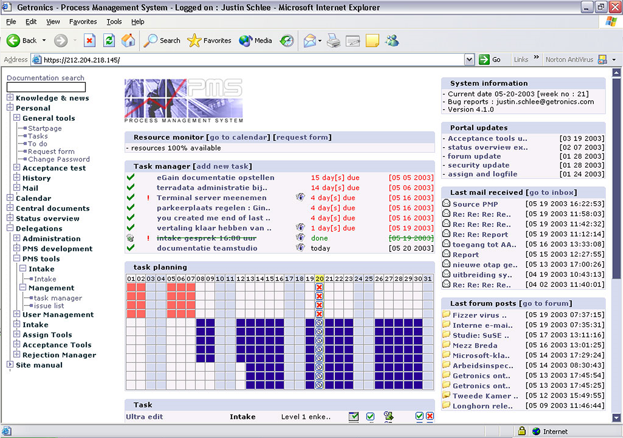 Ik weet niet meer hoe ik het gedaan heb maar parallel aan de band activiteiten werkte ik bij Getronics/KPN als technische specialist bij Rabofacet (nu Rabobank ICT). Rond 2001 ging ik mijn eerste projecten draaien en ik zag al vrij snel de parallel met mijn band. Binnen 6 maanden had ik de `gedoe manager` van mijn band omgebouwd tot een project management tool (v2) waarin elk team lid kon inloggen en alles moest bijhouden. Hierdoor had ik meer tijd om energie te steken in het team. Tijdens de ontwikkeling van de software kwam in aanraking met de wondere wereld van processen. Het project waar ik verantwoordelijke voor was bestond vooral uit handeling die we honderden keren moesten herhalen. De bekende Microsoft Word templates kwamen uit de kast en we begonnen driftig werkinstructies te maken op basis van de de legendarische KPN KPI`s. Binnen mijn applicatie ontwikkeld ik een `process management` oplossing (BPM) om het probleem van templates en instructies te reduceren. Getronics was zo succesvol met dit concept dat ze externe bedrijven ging inhuren die vervolgens ook met mijn applicatie moesten werken. Uiteraard wilde ik de tool doorontwikkelen echter paste dit niet binnen de Microsoft strategie van Getronics. Ik besloot ontslag te nemen en de applicatie zelfstandig voort te zetten.